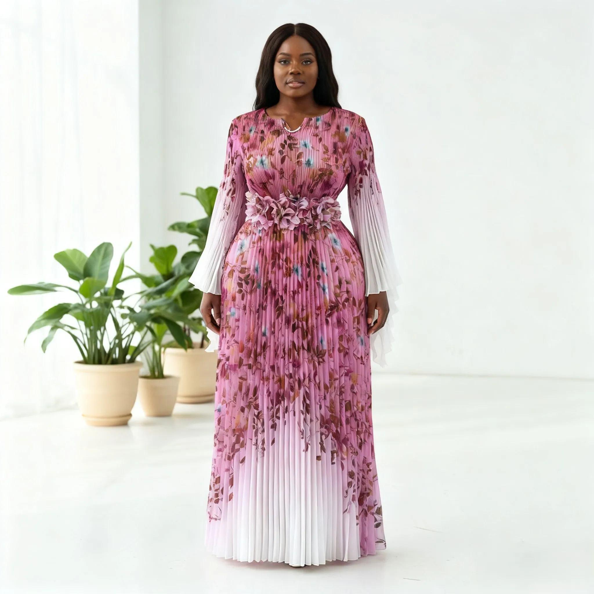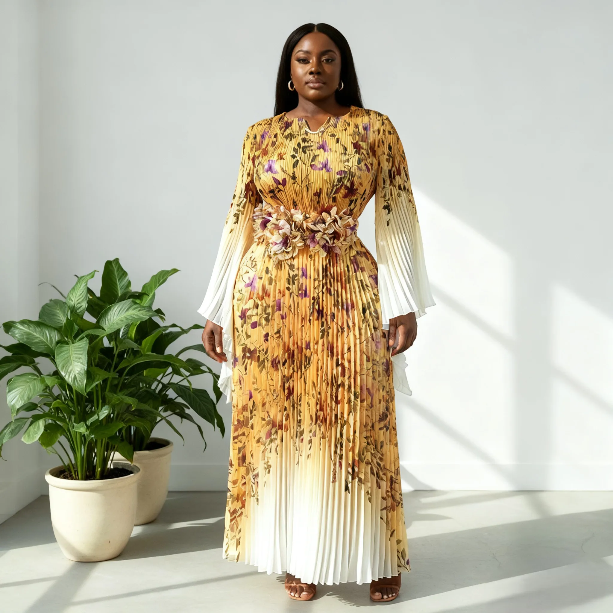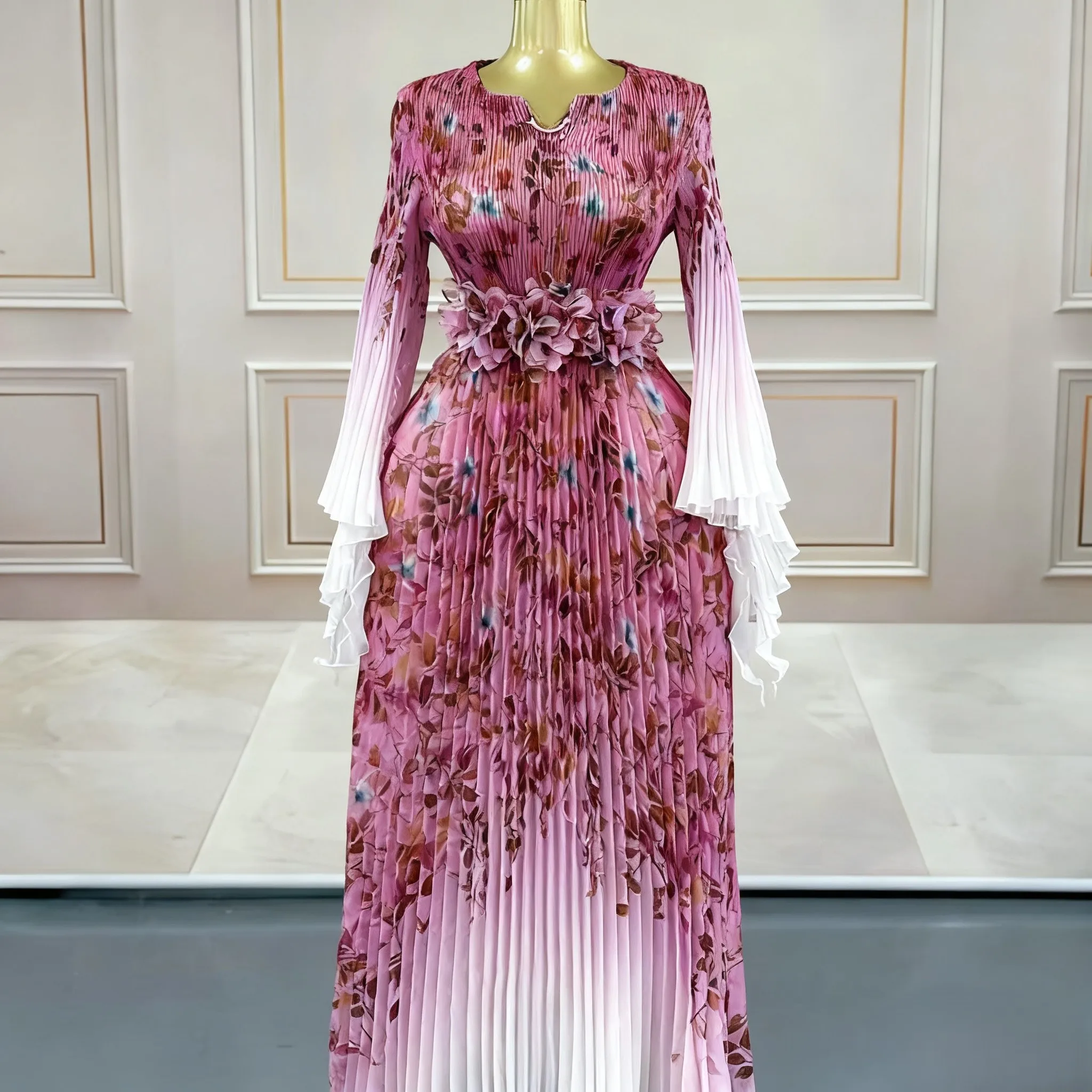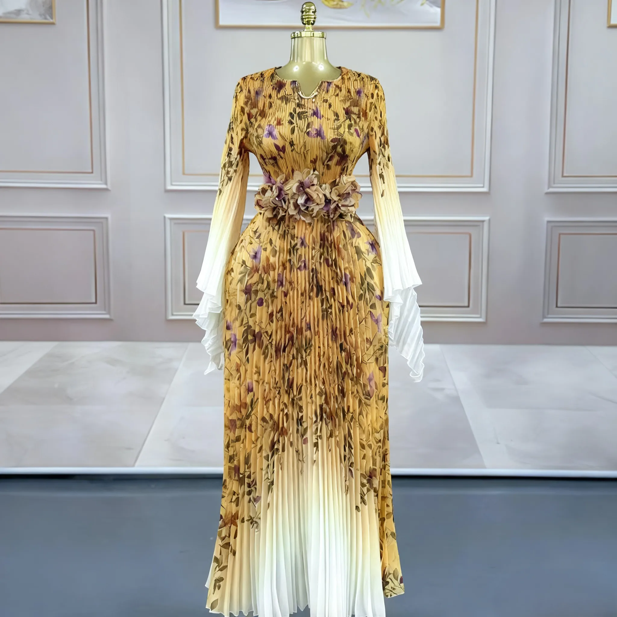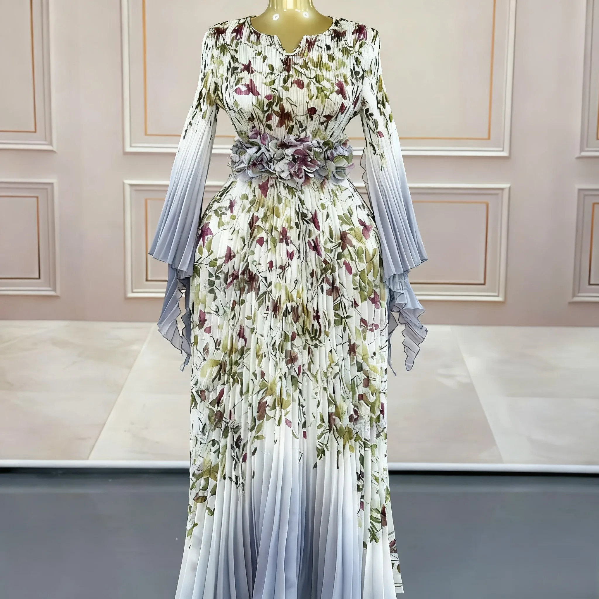 European-style Tsuga Pleated Dress Made of High-quality Organza with Printed Patterns